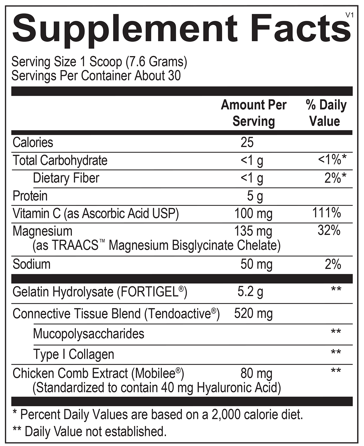 Collagen Ultra contains FORTIGEL® which has been shown in human studies to stimulate collagen regeneration, type II collagen and aggrecan, which all help to maintain healthy connective tissue.1-3 Most therapies simply block joint pain and connective tissue discomfort from exercise, and in doing so inhibit the regeneration and elongation of specific precursors, such as polysaccharides, and deplete nutrients such as vitamin C and magnesium that maintain joint and connective tissue health. FORTIGEL®, TendoActive® and Mobilee® protect and preserve cartilage, tendons, ligaments, intervertebral discs, and fascia. These three clinically studied ingredients support the natural healing process and maintain the structure of connective tissues.