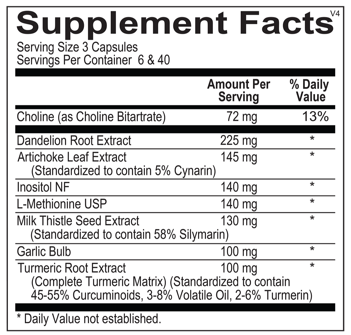 Each capsule includes silymarin (milk thistle seed extract), artichoke leaf extract, turmeric root extract, methionine, choline, inositol, garlic and dandelion root extract. These botanicals and plant extracts contain phytonutrients, antioxidants and other compounds shown to boost liver health and support Phase I and II liver detoxification.